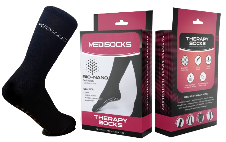 Therapy Socks by Medisocks merupakan stokin atau sarung kaki yang dihasilkan dengan teknologi Bio-Nano Tourmaline iaitu sejenis teknologi akupuntur moden bagi membantu melancarkan penggaliran darah sekaligus membantu masalah-masalah di kaki